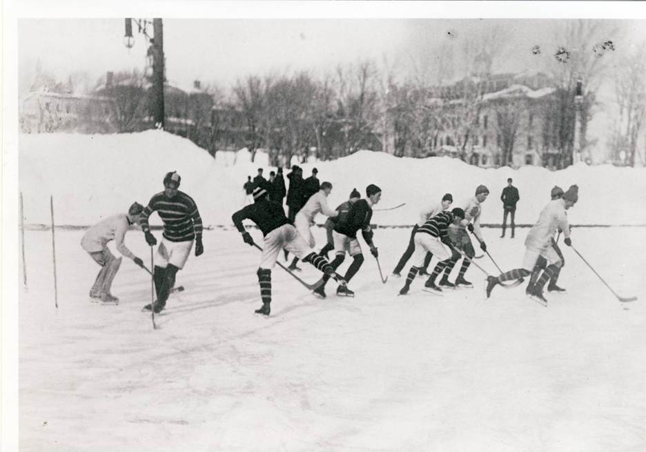 A hockey game at the outdoor rink on the McGill campus, circa 1884. Note the crouching goalie in front of two goal (poles) posts at far left and all players using short blunt-bladed sticks. LIBRARY AND ARCHIVES CANADA C17831